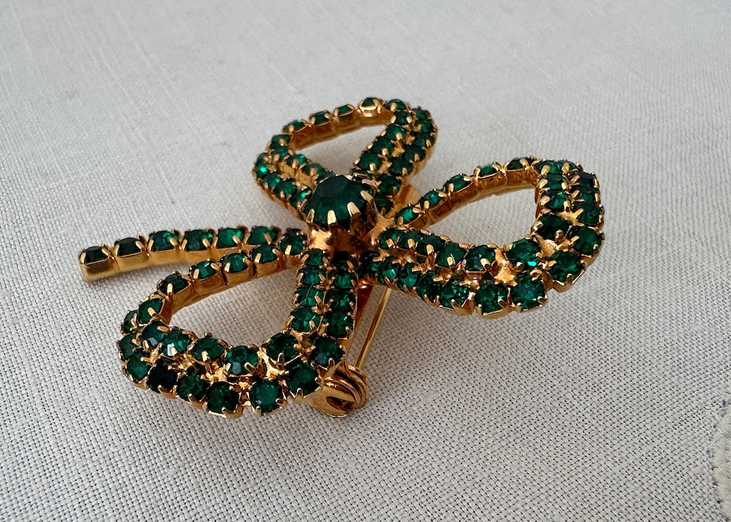 Celebrate St. Patrick's Day in sparkling style with this charming vintage brooch featuring a shamrock clover design. Crafted in gold-tone metal and adorned with brilliant emerald green rhinestones.