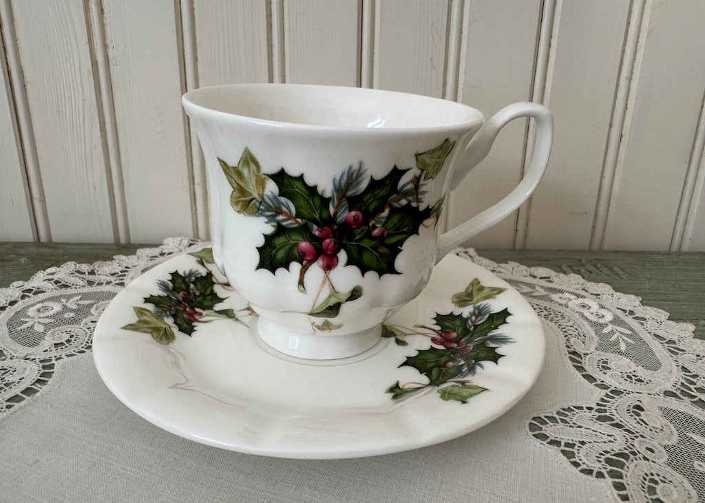 A very pretty vintage Christmas teacup and saucer. A spray of holly, hollyberries, english ivy, and evergreens on a snowy white bone china. Sweet shape to the cup and saucer.