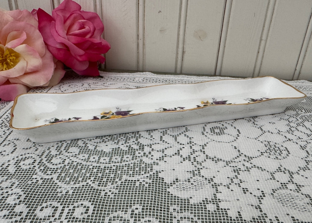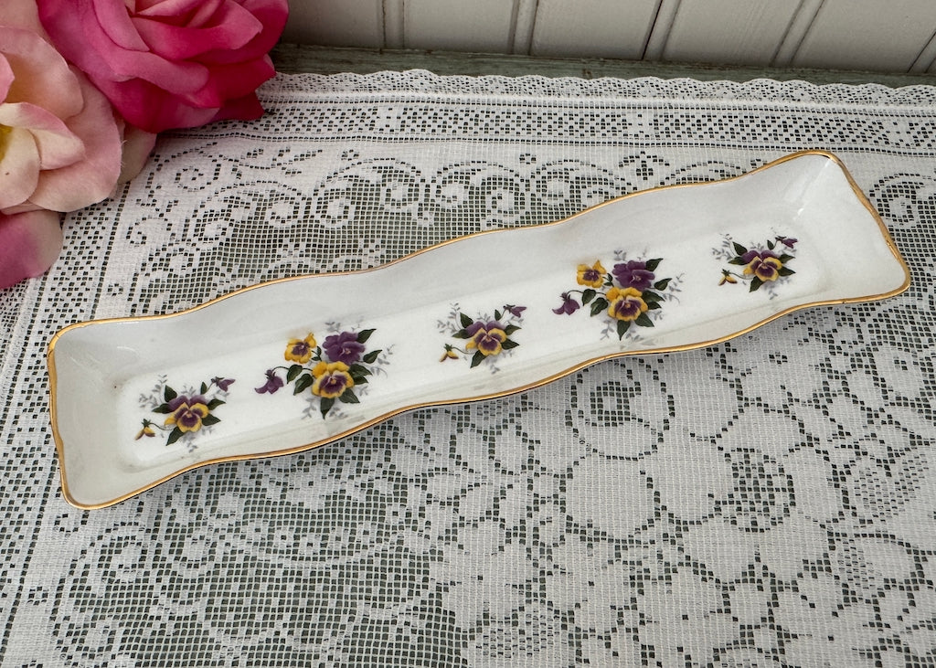 A lovely vintage olive or trinket dish. Scalloped edges trimmed in gold. Dotted with sprays of yellow and purple pansies. So cheery! Perfect for olives but also wonderful for trinkets on a vanity.