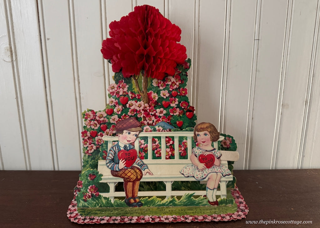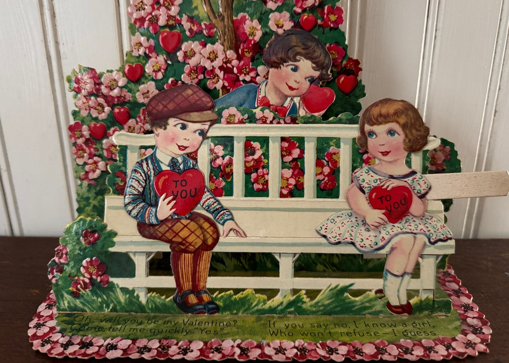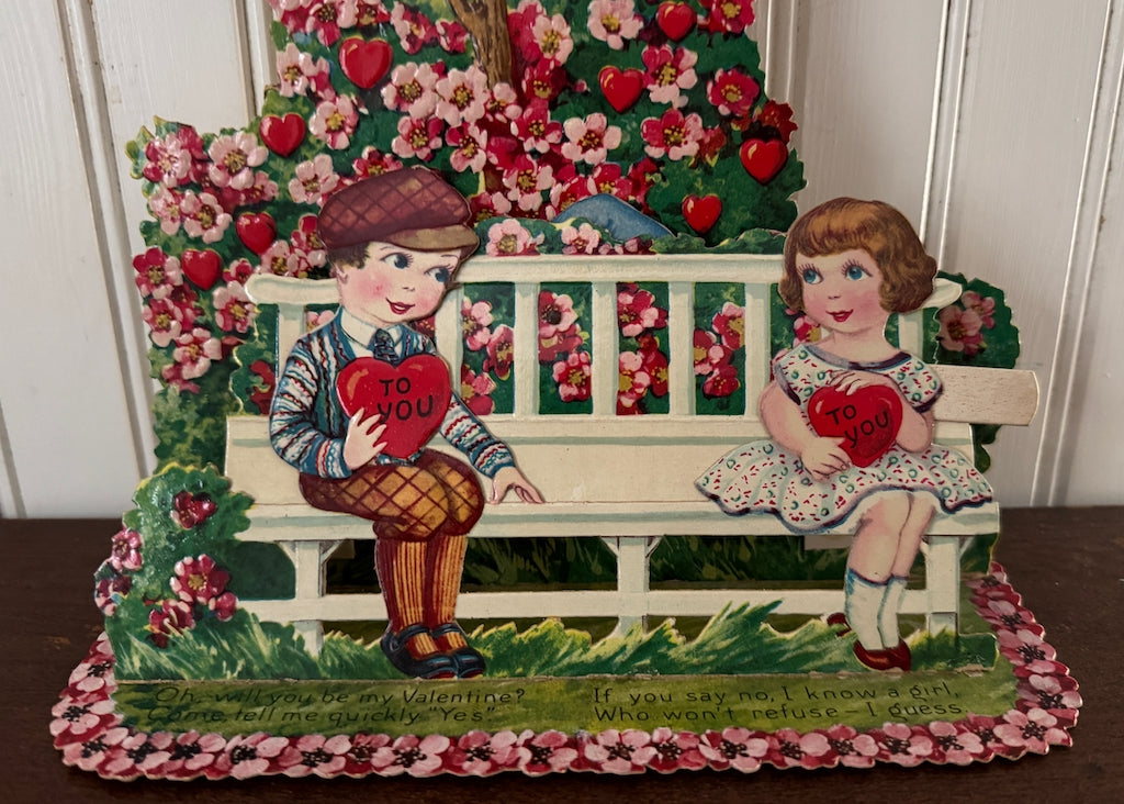 This is a very sweet antique Valentine's Day card. Features a large apple tree with apple blossoms and little red hearts. The top of the tree is a red tissue paper honeycomb. A little boy and girl are sitting on a bench under the tree. Both holding a Valentine. Under the children it says, "Oh, will you be my Valentine? Come, tell me quickly Yes" and "If you say no, I know a girl, who won't refuse, I guess." There is a little mechanical handle that when pulled brings up another little boy, gazing at the little girl and holding a red heart. So very charming!