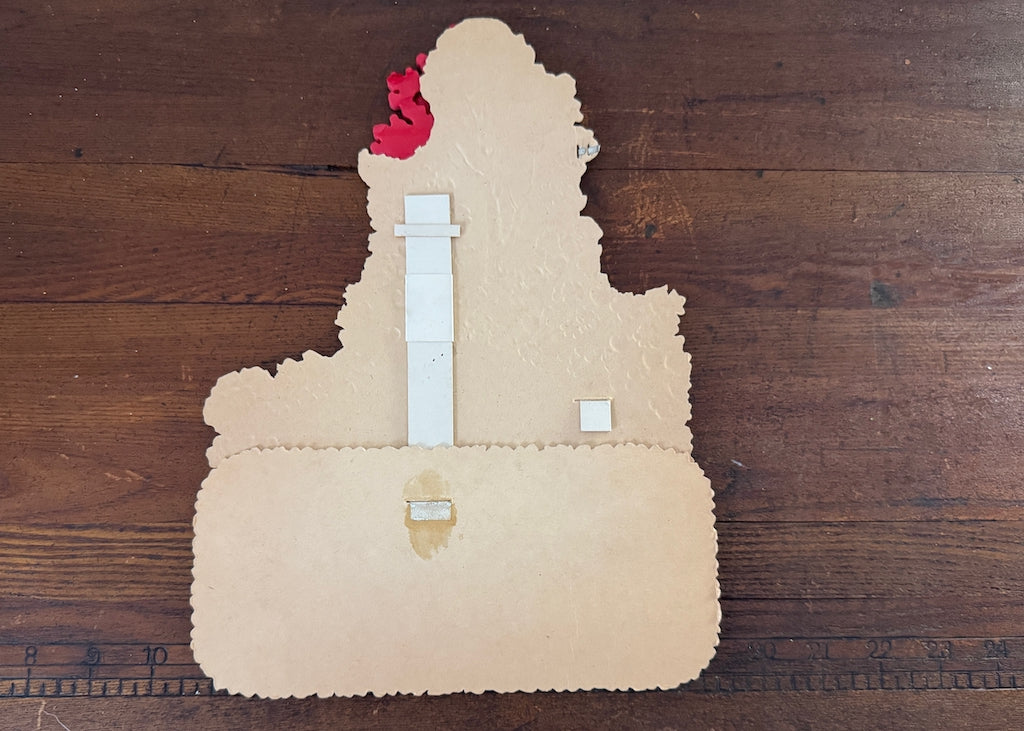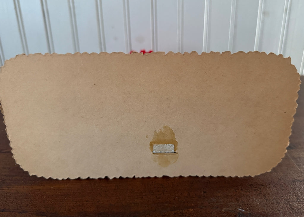Measures 11 5/8 by 9 5/8 inches wide. The base 4 inches. Graphics are bright and colorful. The bench where the children are seated needs to be reattached to the back so it stands straight. The little girl has a crease at her neck. Despite these issues, this antique Valentine displays beautifully.