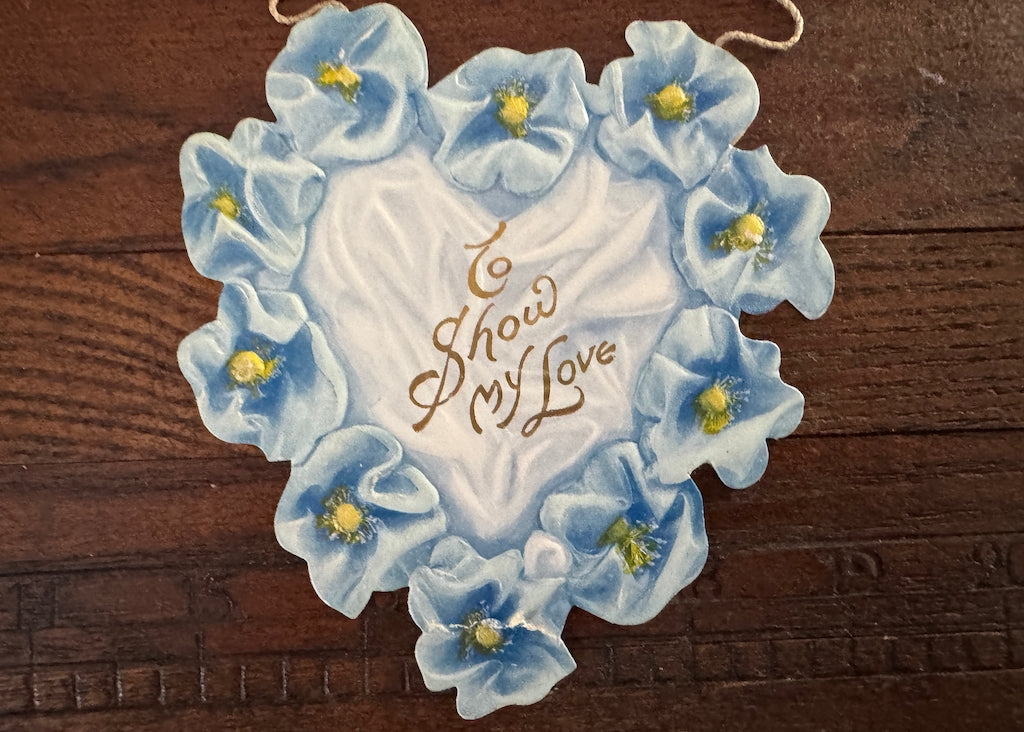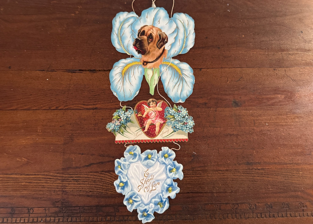 A beautiful antique Victorian Valentines Day card. Made of three die-cut panels connected with a satin twisted ribbon. The first is a blue iris with the portrait of a mastiff dog. Next is a cherub on a red heart surrounded with blue forget-me-nots. Next is a heart shaped of blue violet like flowers. All have gold accents.