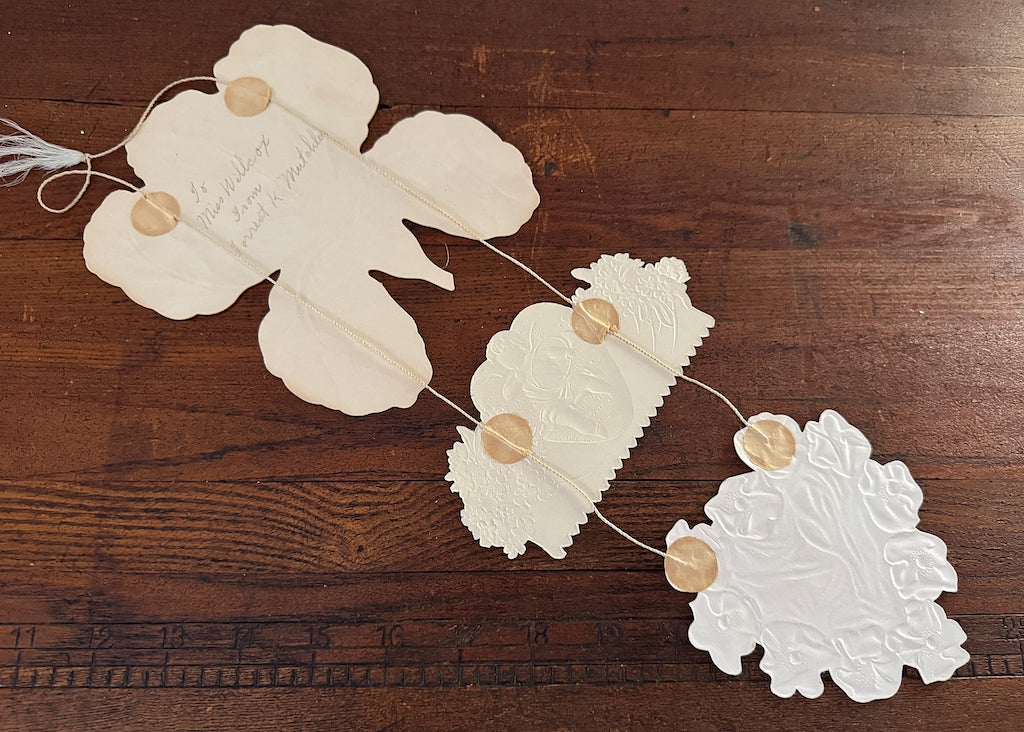 Overall measures 17 inches from the hanging ribbon to the bottom of the last panel. Signed on the back "To Miss Wilcox, From Forrest K Mutchlor." Great condition but the very bottom of the last hard has a fold line.