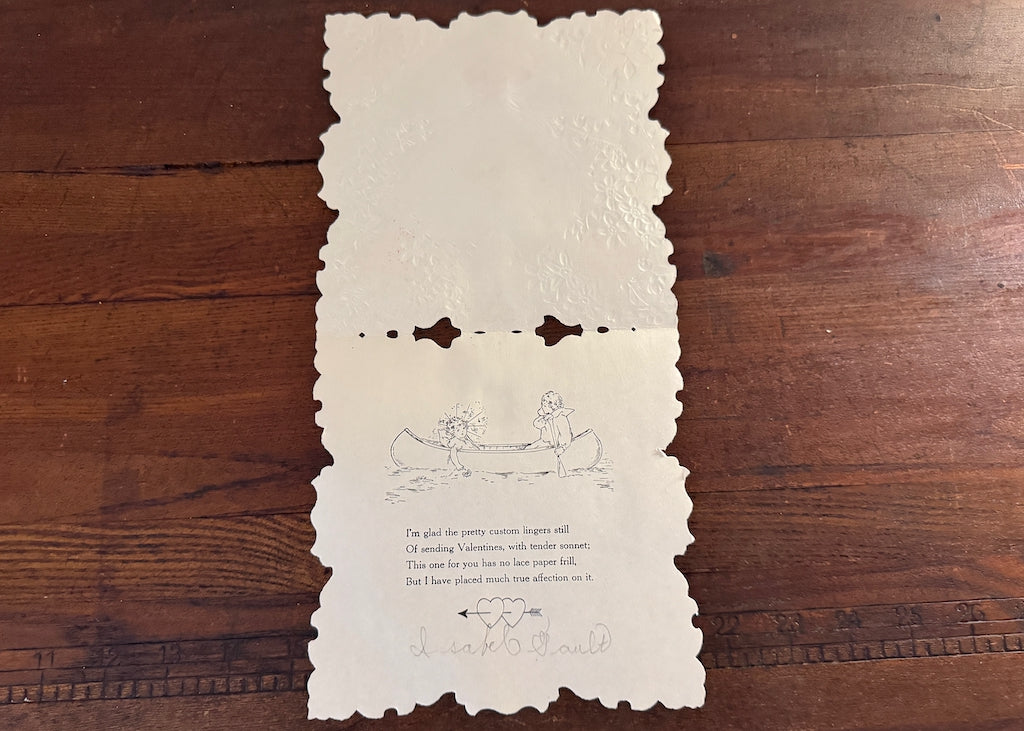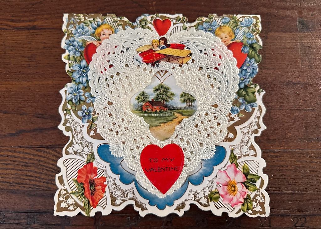 A very sweet vintage Valentine's Day card. The background feature is embossed paper with cherubs in blue flowers. The bottom two corners have a poppy and an apple blossom with lily of the valley against gold. A paper lace heart "pops up" from the card and frames a peaceful country road and home. Added graphic of a red heart and a little couple in a plane. Pretty on the inside too with the Valentine greeting. Signed by the giver Isabel Gault.