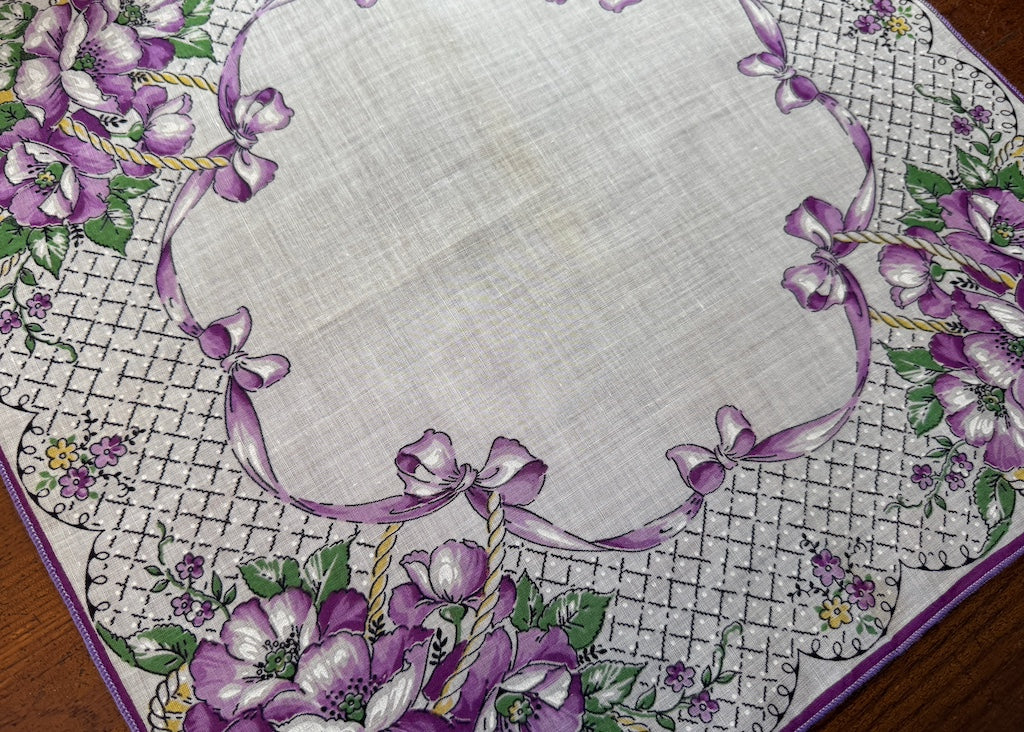 A very sweet vintage handkerchief! Each corner has a basket of purple poppies set against a lacy swag that is adorned with little matching forget-me-nots. The baskets are brought together with a flowing ribbon and bows.