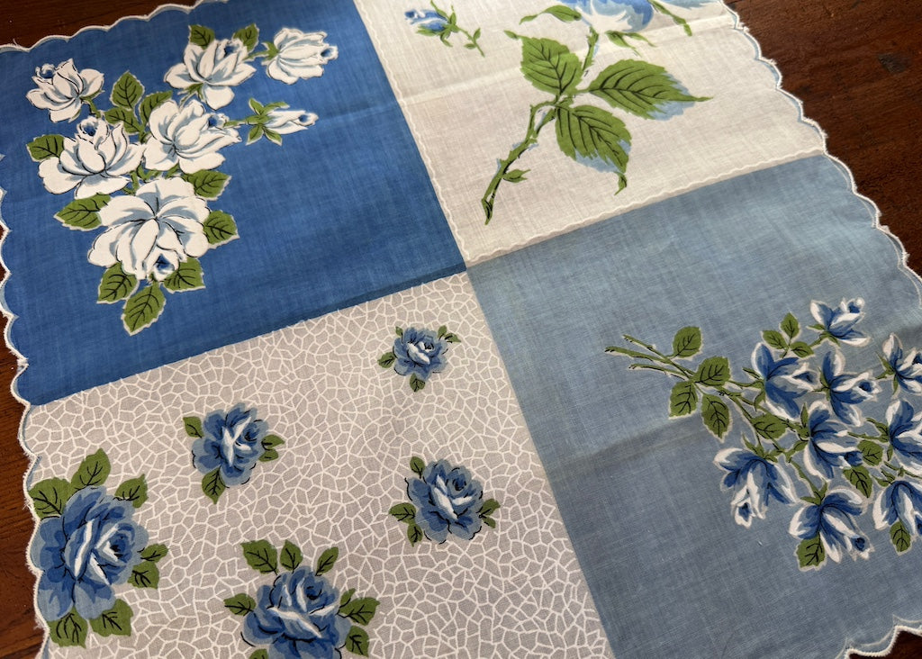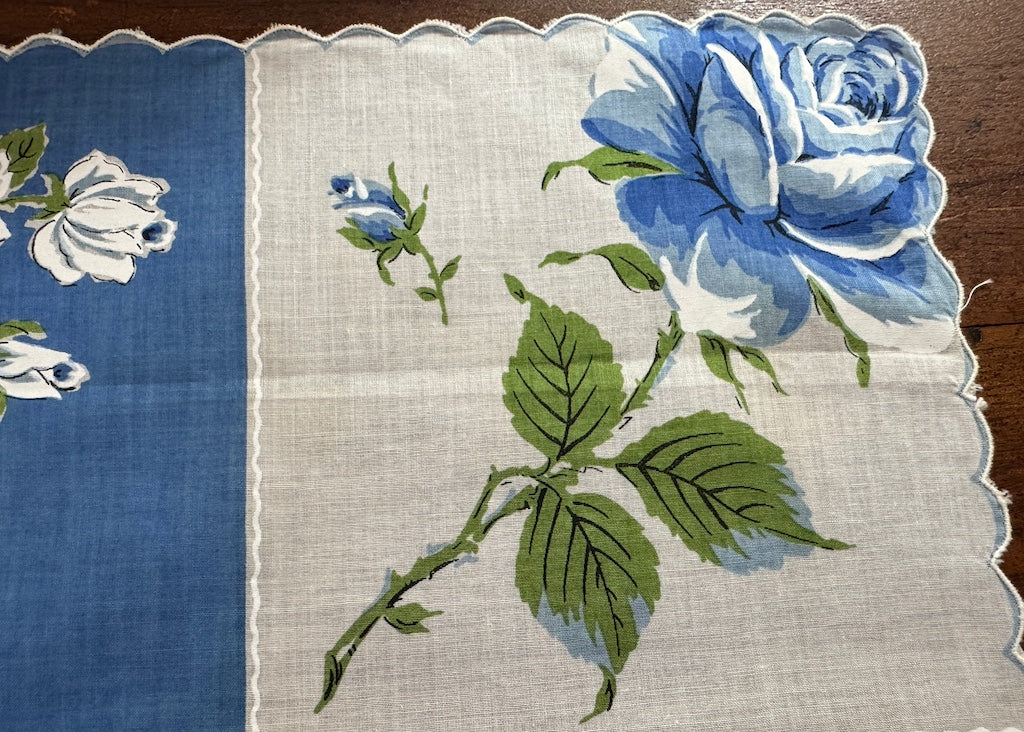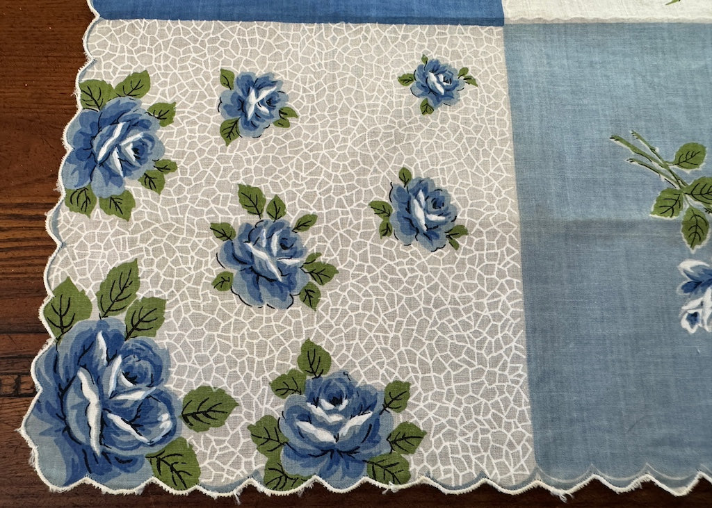 A very striking vintage handkerchief. The hanky has four different squares. A spray of white roses on a medium blue background. A large blooming blue rose on white. A bouquet of petite blue roses on blue. Lastly, various sizes of blue roses scattered on a white pebbled background. All four come together to make a gorgeous design. The edges are scalloped.