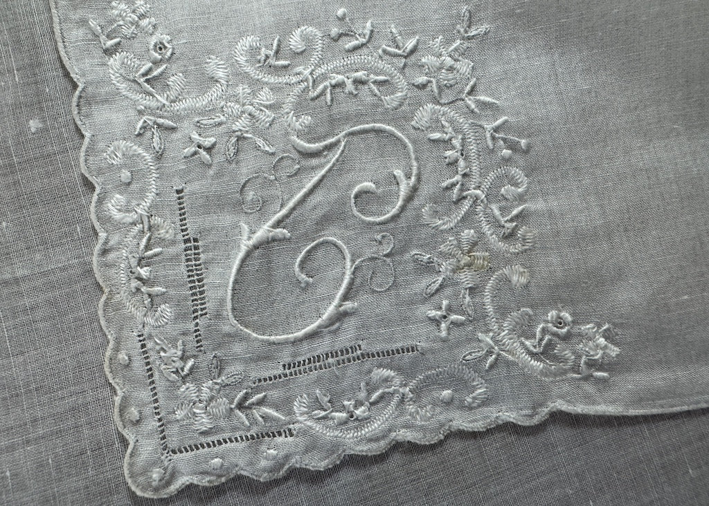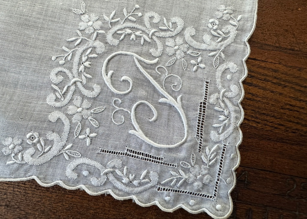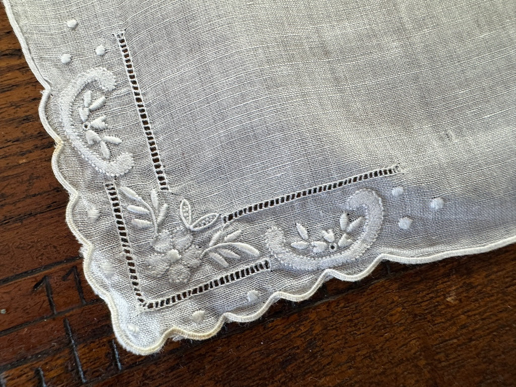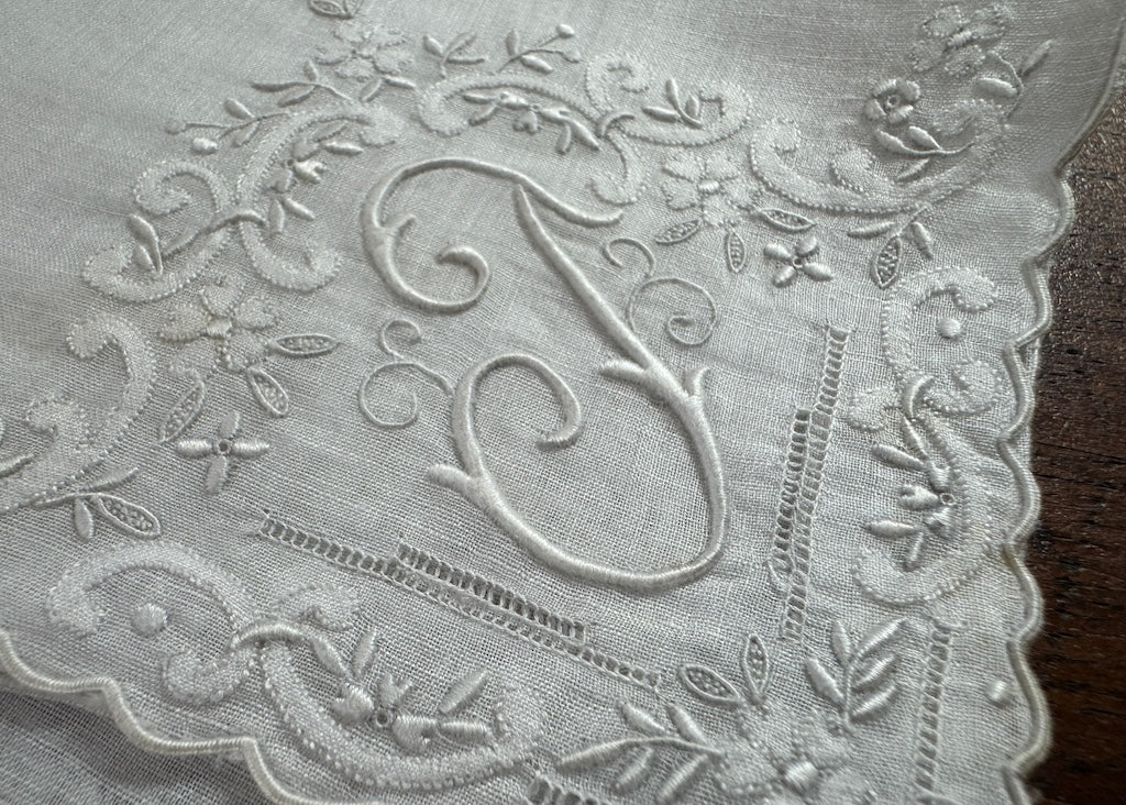 An elegant vintage Madeira monogrammed handkerchief. Crisp, snowy white linen with hand rolled edges. One corner has scalloped edges and beautifully embroidered fleur-de-lis designs and daisies surrounding an embroidered "F."