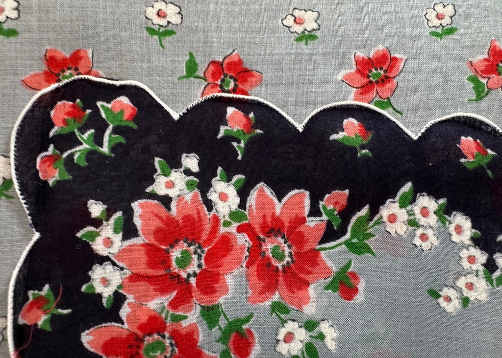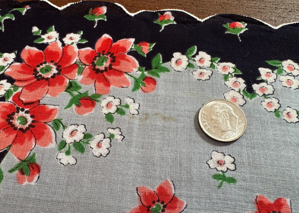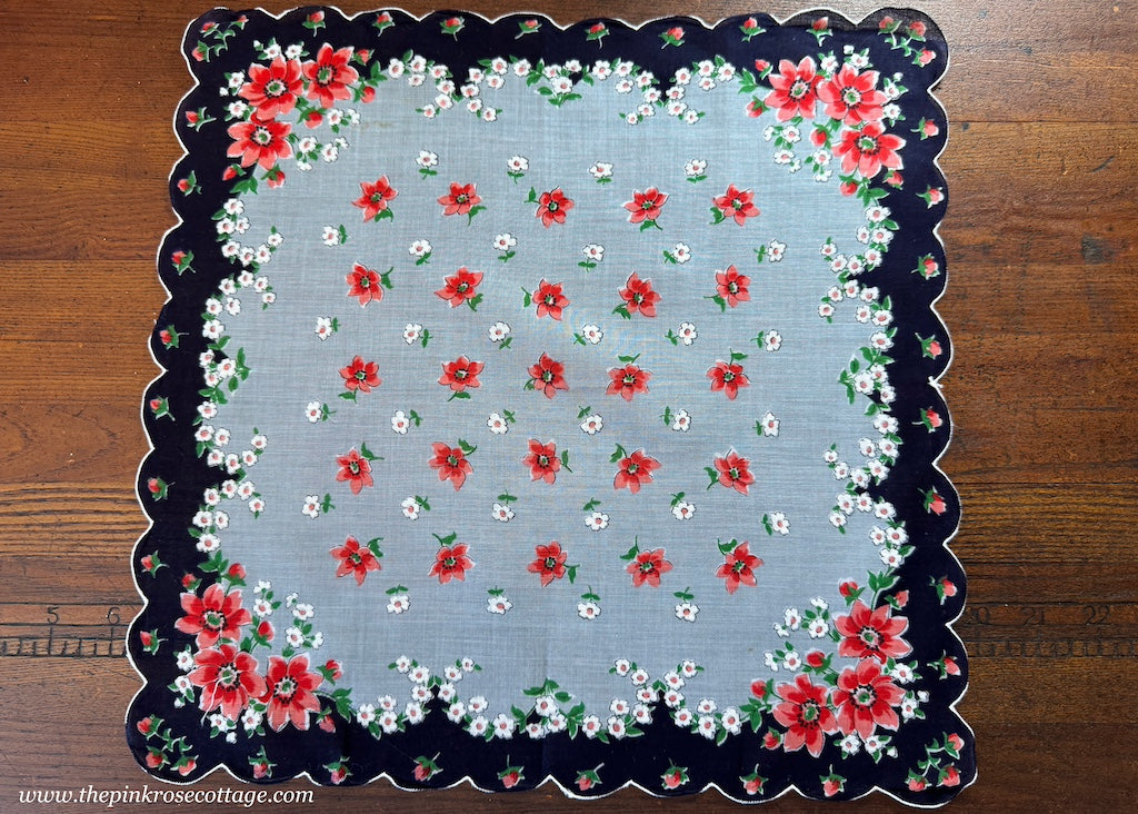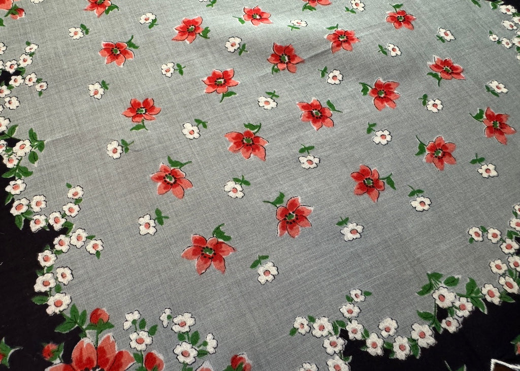 A lovely vintage handkerchief! Pink and red posies float across the soft gray center. Each corner has a matching trio of full bloom flowers. Accented with white forget-me-not flowers and framed by scalloped edges in black.