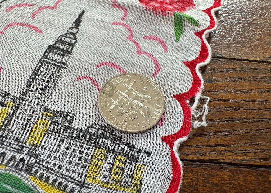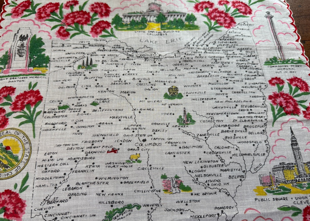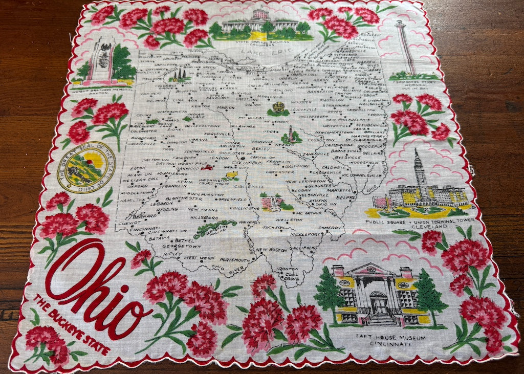 A beautiful vintage souvenir hanky! Various graphics of landmarks and lovely red carnations surround a map of Ohio. Features the Wright Brothers Memorial in Dayton, the Taft House Museum in Cincinnati, the State Capital Building in Columbus, and many more! Red border along the white stitched scalloped edges.