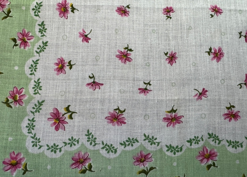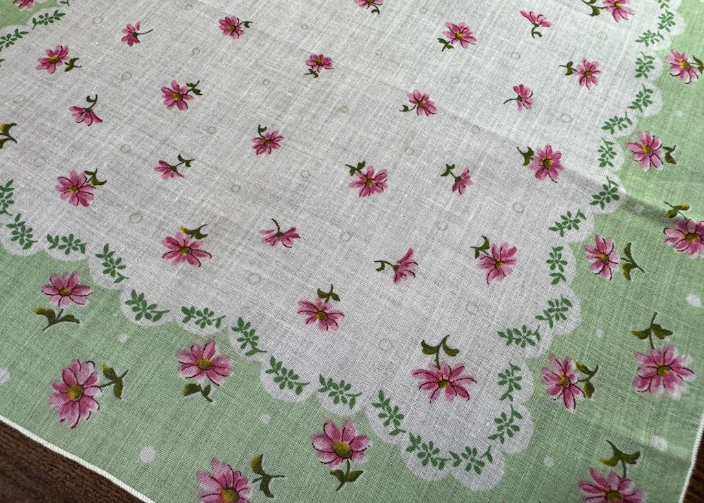 A pretty vintage hanky! Features a white cotton center with light green border and pink daisies scattered throughout. Small white polka dots mixed in. So lovely!