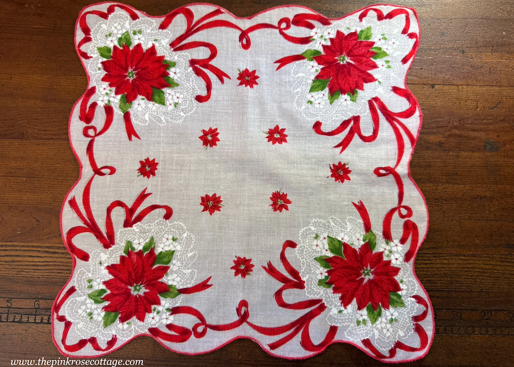 Vintage Poinsettia Red Ribbon and White Lace Christmas Handkerchief