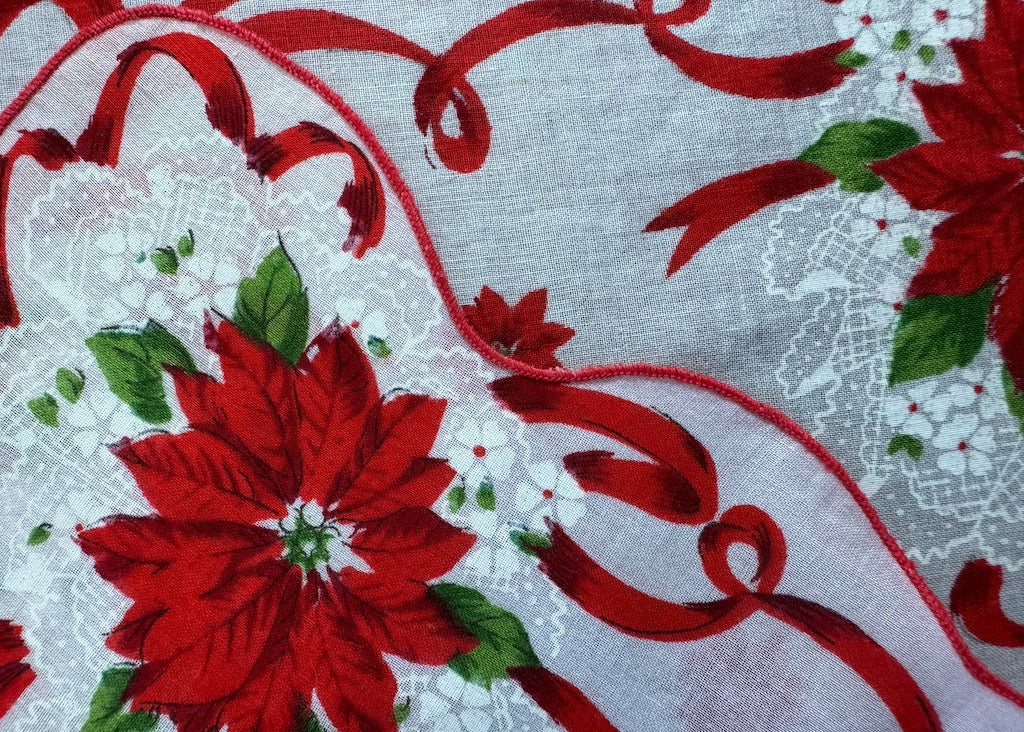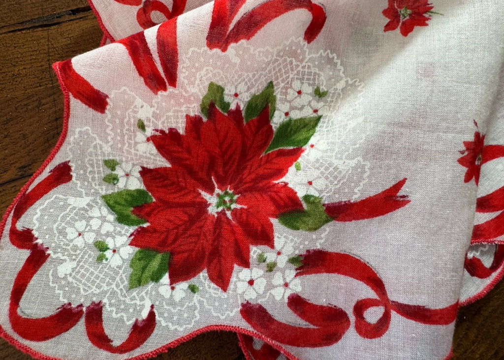 A beautiful vintage Christmas hanky! Bold red poinsettia bouquets with white floral accents are surrounded by white lace and red ribbons in each corner. Small red poinsettias scattered in the middle of a sheer white cotton background. Red scalloped edges.