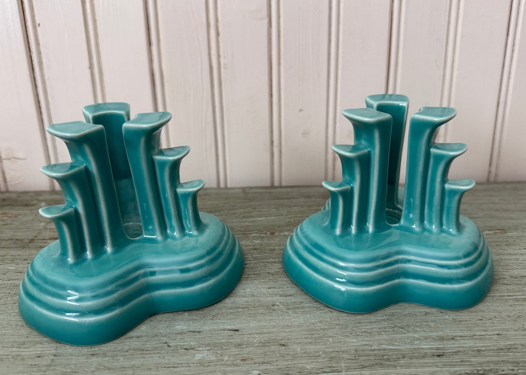 Two P86 vintage Homer Laughlin Company Fiesta pyramid tripod candle holders. Bold geometric design in much loved turquoise color. Stable tripod base holds tapered candles.