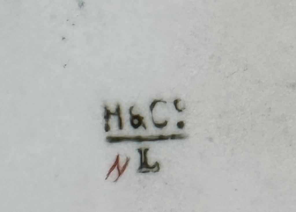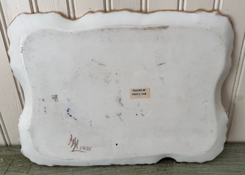 Measures 11 by 8 inches. Marked, "H & Co, L" for Haviland Company and Limoges France. Artist signed with initials and date of 1891. Also has a label with the previous collector. Great condition with a bit of wear to the gold gilt.