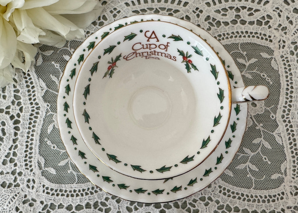A darling Christmas teacup. Features sprays of Christmas holly. The inside of the teacup has "A Cup of Christmas Tea." Gold trim.