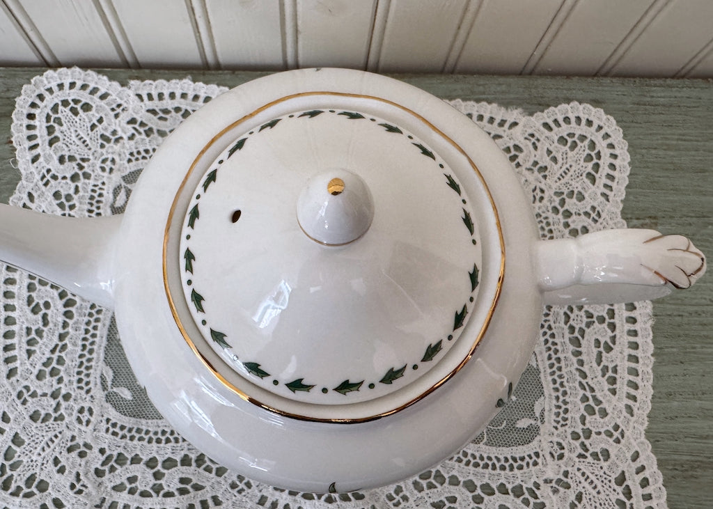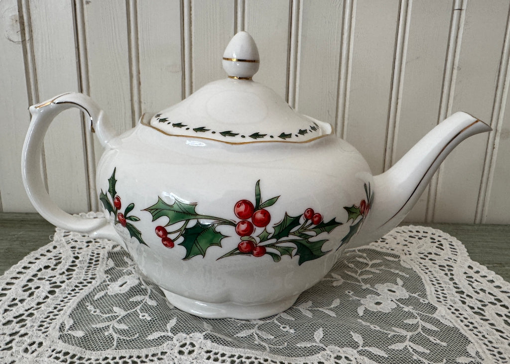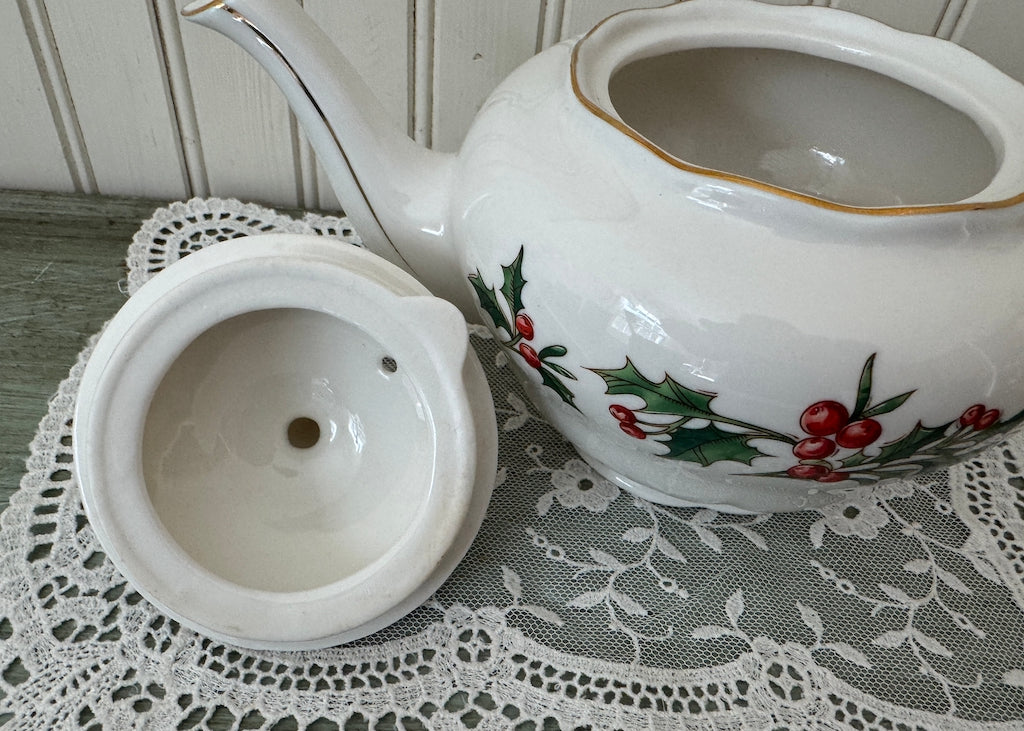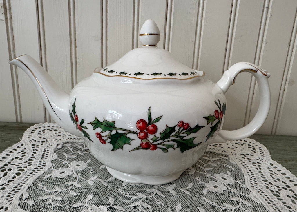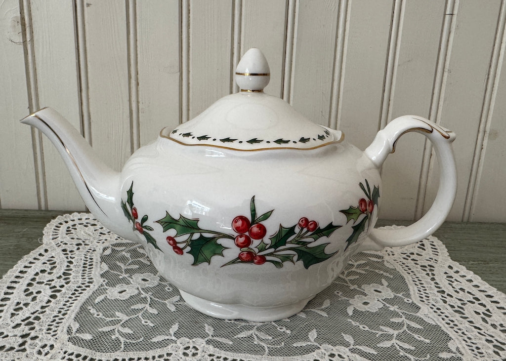 A beautiful vintage teapot for the Christmas season! Traditional and elegant design. Spray of holly berries around the pot. Holly leaves on the lid. Gold gilt trim.