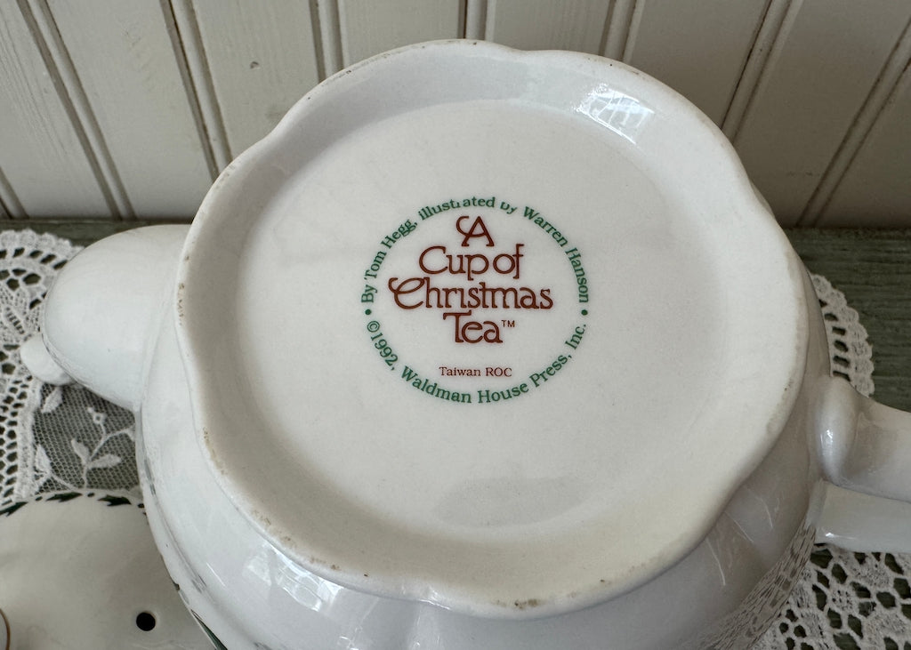 The bottom of the tea pot is marked, "A Cup of Christmas Tea, Bone China, By Tom Hegg, Illustrated by Warren Hanson, 1992, Waldman House Press Inc." Excellent condition.