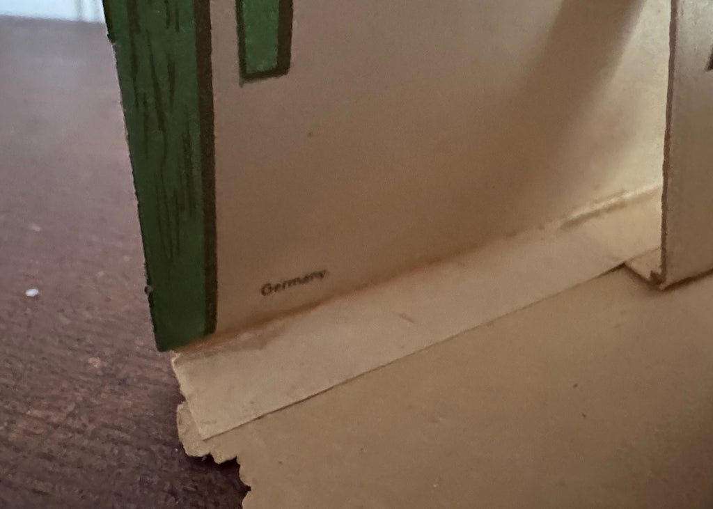 Measures 8 1/2 by 5 5/8 inches. Overall it's gorgeous, but does have a few issues. There are a few minor bends to the sides. The piece of cardboard that holds cupid is missing because of this, the tissue paper on the red honeycomb flower has a few tears. Still displays beautifully.