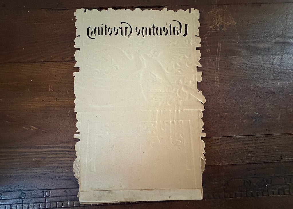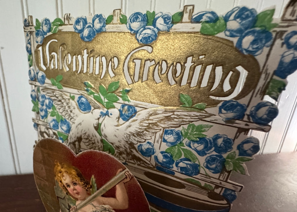 This antique Valentine's Day card is so lovely! "Valentine Greeting" is cut out of gold at the top of the card. Lattice is covered with blue roses. A mandolin lays on a table. Cupid is asleep on green grass with a little kitty watching him. Above a cherub opens a chest of Valentine treasures. When closed, the base has the Valentine greeting as is accented with forget-me-not hearts dotted with gold. When opened, the card becomes three dimensional and has a small honeycomb flower at the bottom.