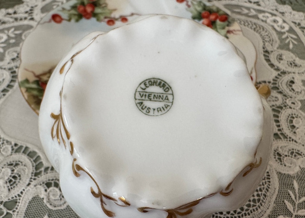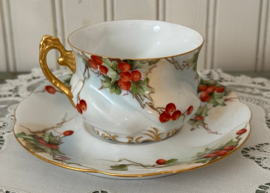 A beautiful vintage hand painted antique teacup and saucer. Artistically adorned with sprigs of holly and hollyberries. Generous gold gilt trim. Elegant shape to the cup and the saucer. So very charming!