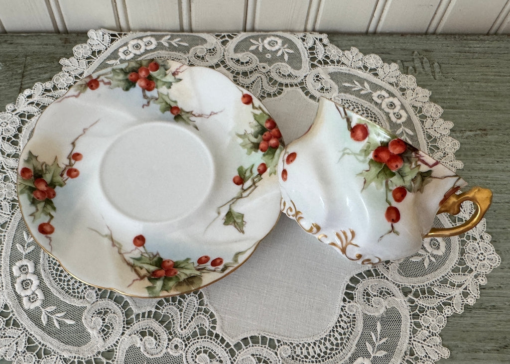 Antique Hand Painted Christmas Holly Berry Teacup and Saucer
