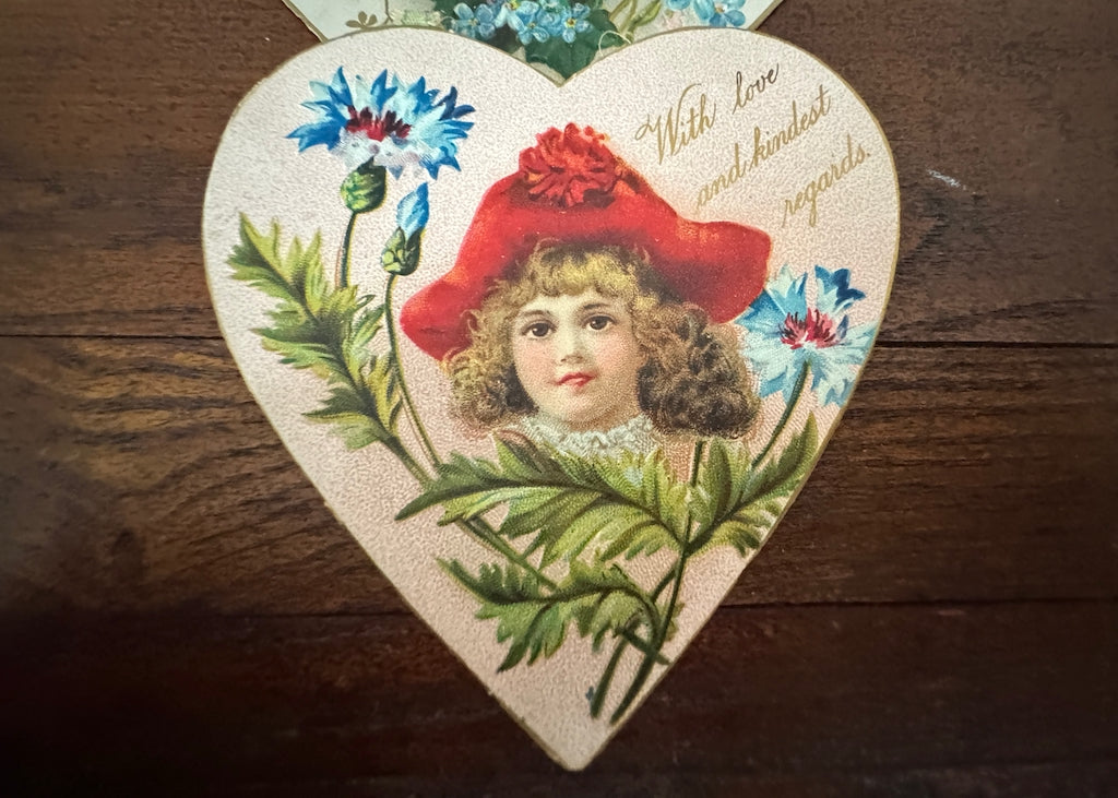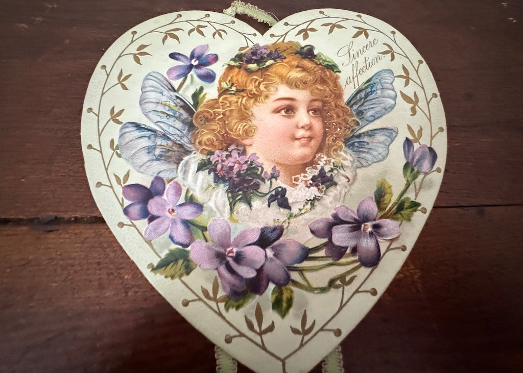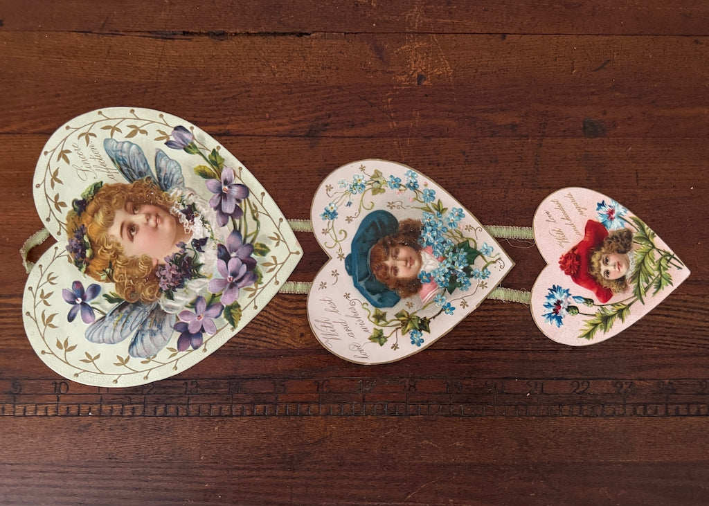 A wonderful antique Victorian style greeting card that would be perfect anytime of the year, but especially for Valentine's Day. Three die-cup hearts held together with a soft green satin ribbon. The top heart has a little girl with fairy wings surrounded with purple violets. The second is a little child with a big blue hat surrounded with forget-me-not flowers. Lastly is a little girl with a big red hat. She is amongst blue bachelor buttons. So charming!