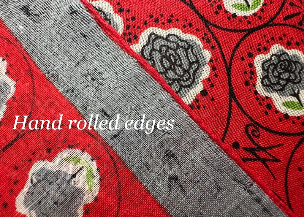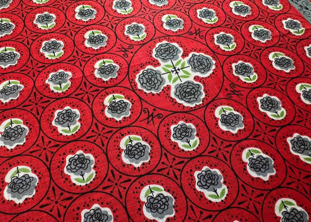 A striking vintage handkerchief by artist Betty Anderson. Single gray stylized roses against read are circled with medallions. The pretty roses have green petals. The border has a scrolling design and is further accented with red, hand rolled edges.