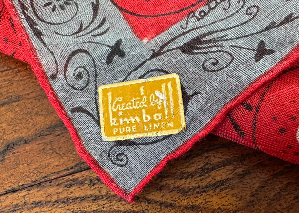 This vintage hanky measures about 13 inches square. Retains the original "Created by Kimball, Pure Linen." label. Signed by the artist, Betty Anderson. Excellent, unused condition.