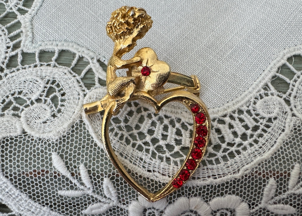 Vintage Cherub and Rhinestone Heart Pin