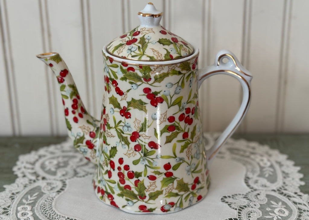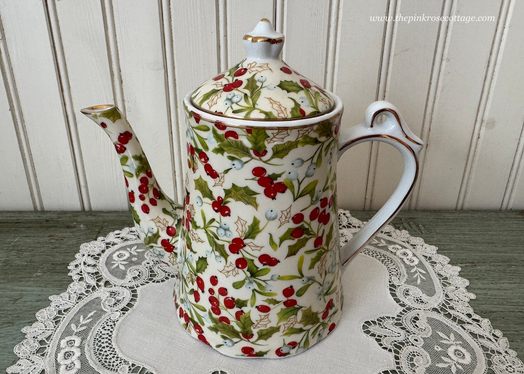 A beautiful and elegant vintage coffee or tea pot and cups for Christmas. The pattern is an all over chintz design with holly berries and mistletoe. Gold trim.