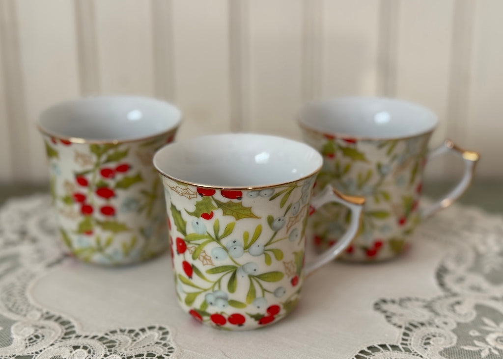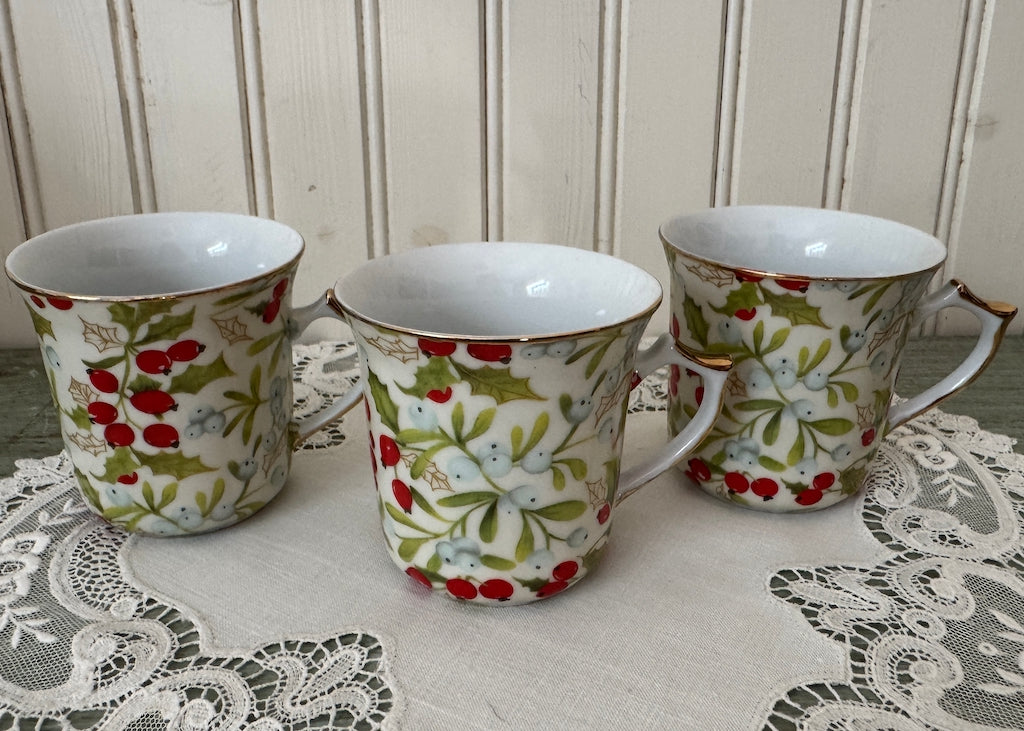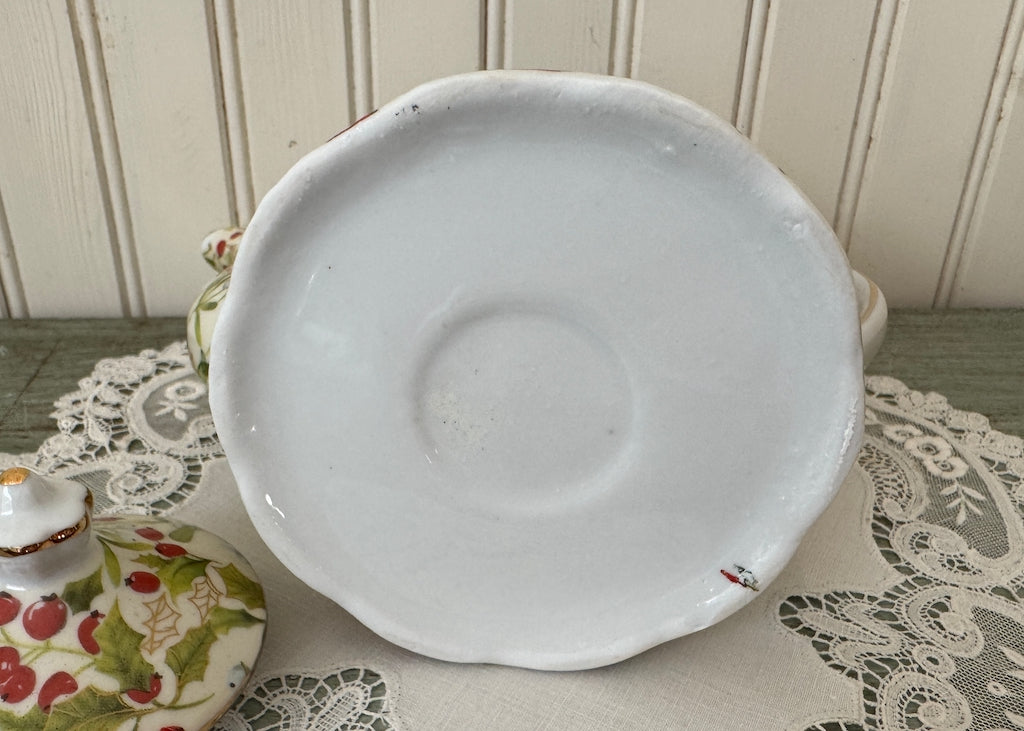 Vintage Christmas Chintz Holly Mistletoe Coffee Tea Pot and Cups
