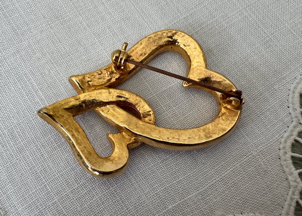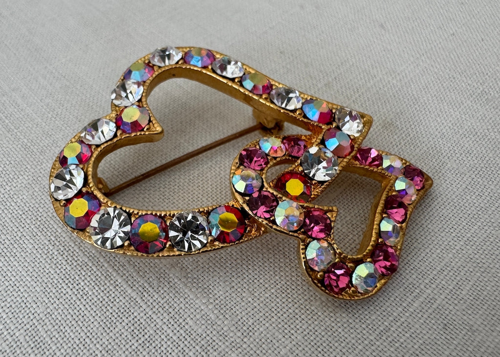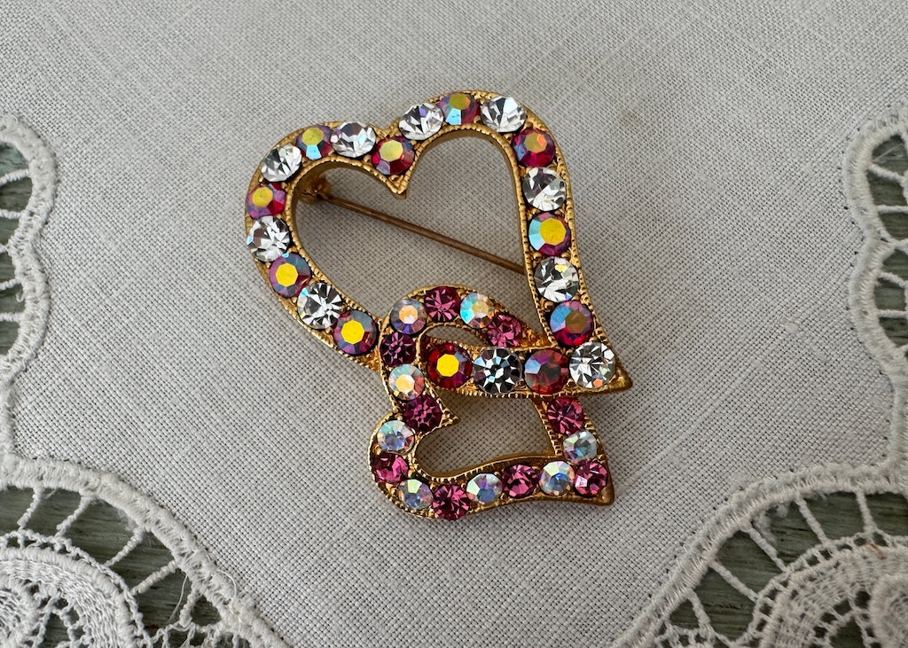 Vintage Valentine's pin featuring dual red and white rhinestone hearts in gold tone metal with aurora borealis sparkle. Catches the light beautifully!