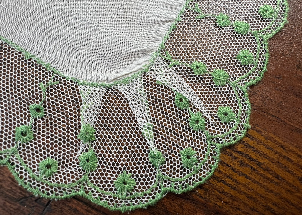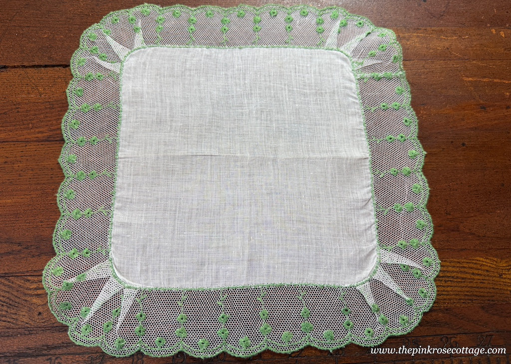A beautiful and classy hankie! A white linen background with embroidered net lace trim. Charming petite green daisy-like flowers.