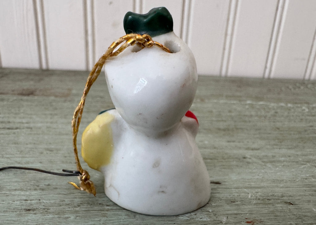 A very cute vintage Christmas bell ornament. A little girl, all wrapped up in a long coat with a holly berry adorned hood and a big red bow at her neck. She's holding a Christmas wreath.