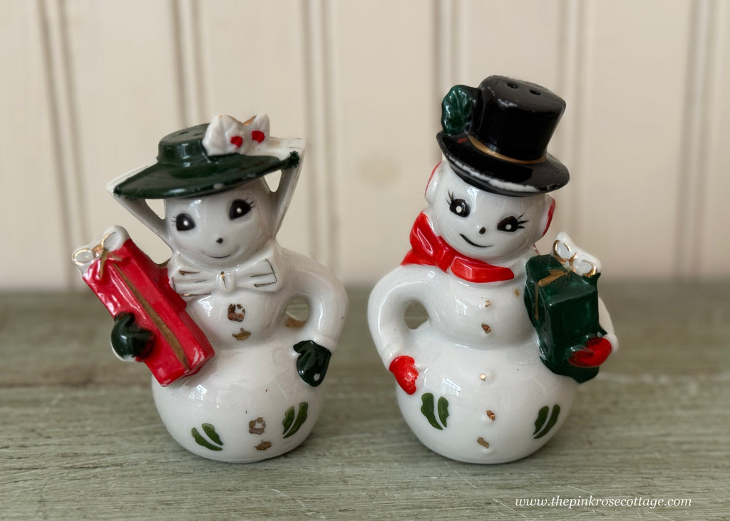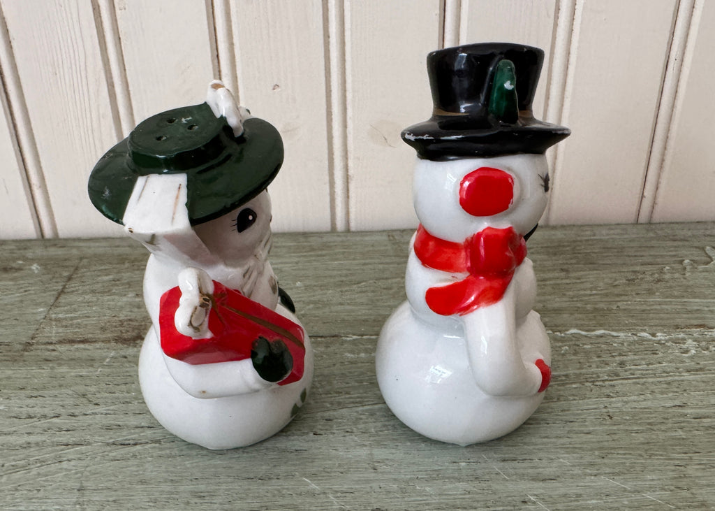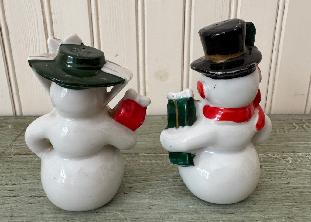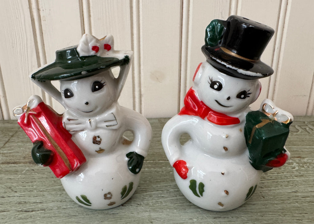 A very sweet set of vintage salt and peppershakers for Christmas. Mr. and Mrs. Snowman are dressed for shopping. Mrs. is wearing a green bonnet secured with a scarf. She is carrying a package. Mr. Snowman has a dapper top hat, red scarf, and is carrying a green package. Both are adorned with sprigs of holly.