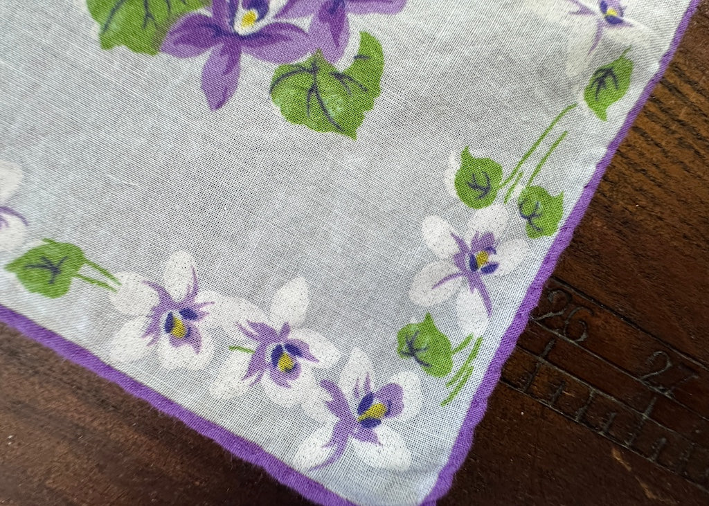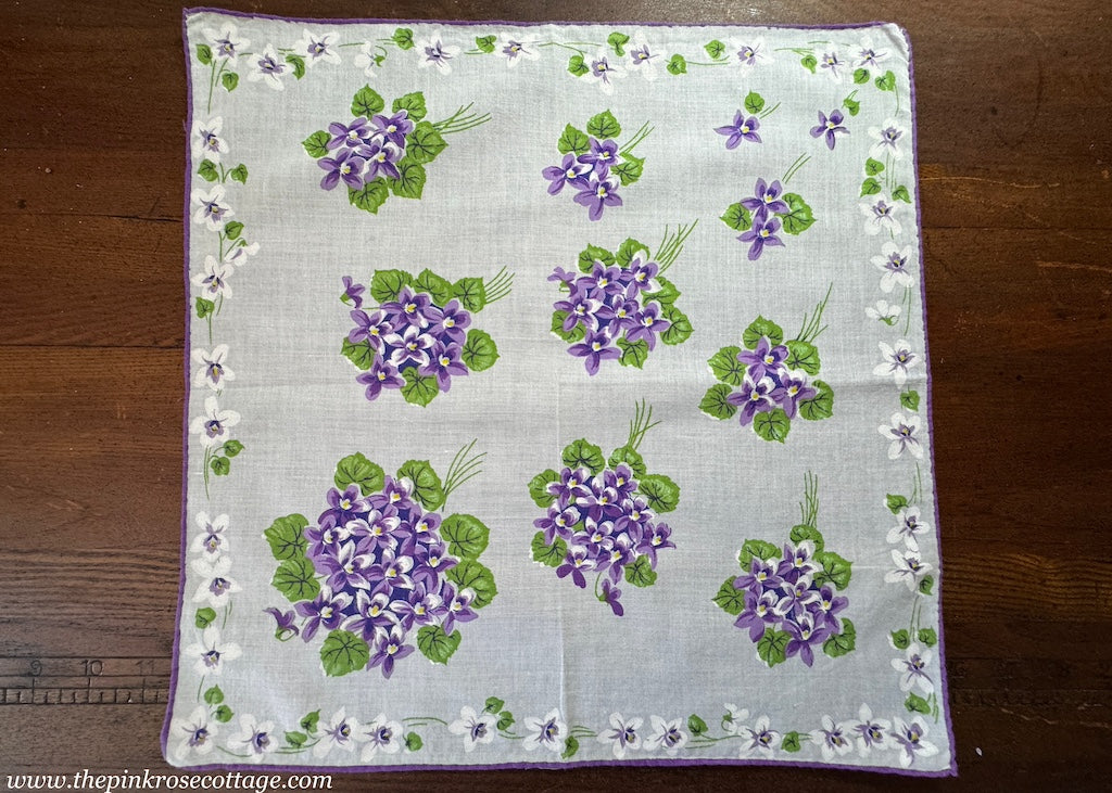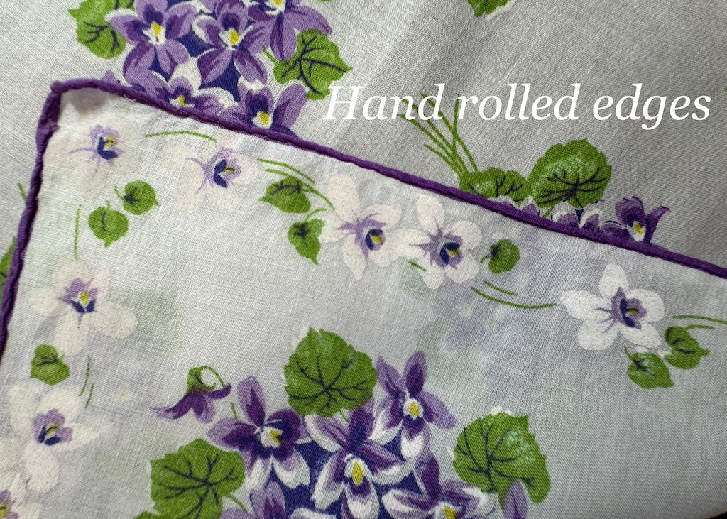 A pretty vintage hanky! Features purple violet bouquets scattered on the white cotton background. A border of white violet buds and green leaves surround the purple hand rolled edges.