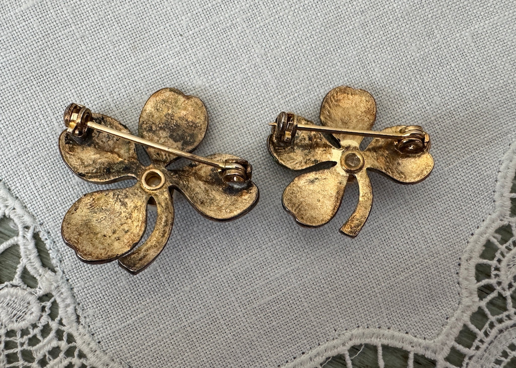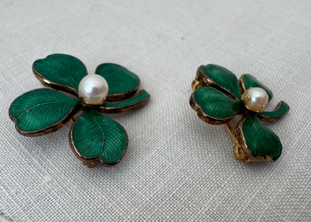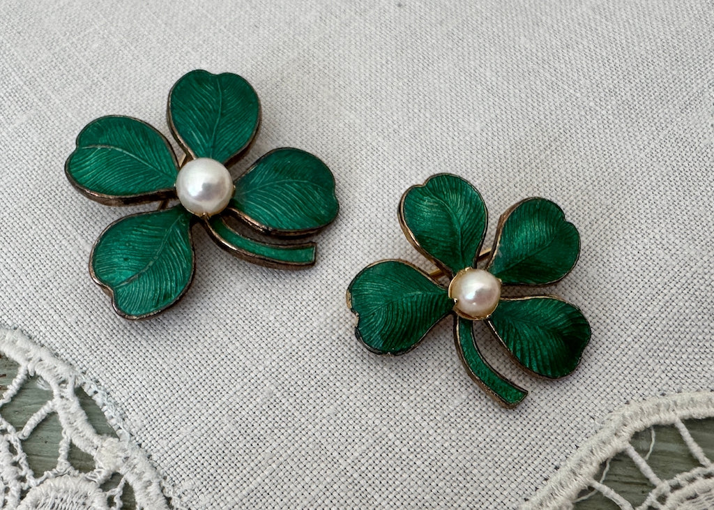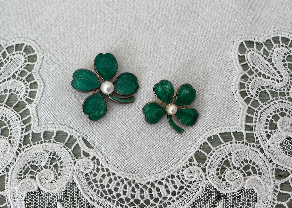 Embrace the Luck of the Irish with this charming pair of vintage scatter pin set! Each features delicate guilloché work and lustrous pearl accents, with classic shamrock and clover designs.