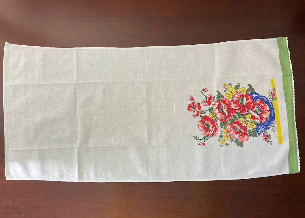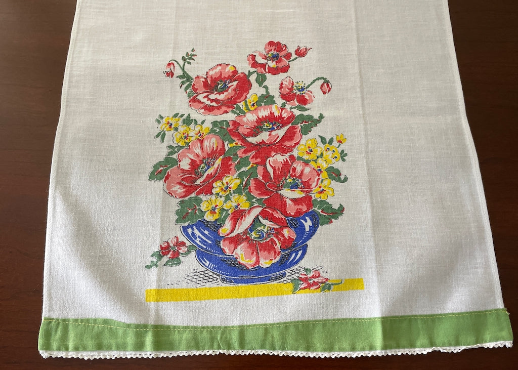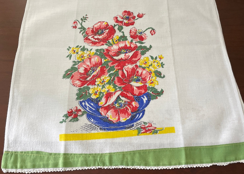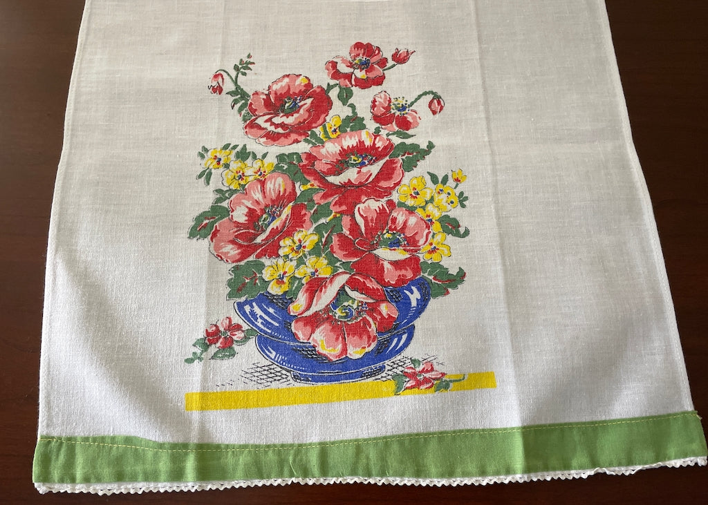 A sweet vintage tea towel. Features red and pink poppies with yellow buttercup accents, beautifully arranged in a blue flower pot. The edge of the towel has an appliqued green front border and tiny white rick-rack trim.