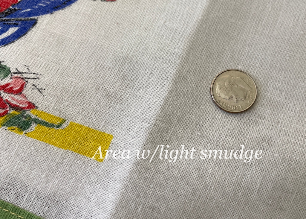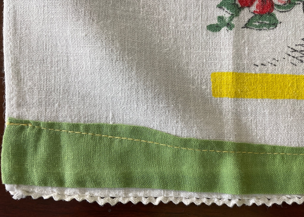This vintage towel measures 33 1/2 inches long and 15 5/8 inches wide. Cotton. One small area with a smudge and one corner of the top edge is frayed. Otherwise great condition.