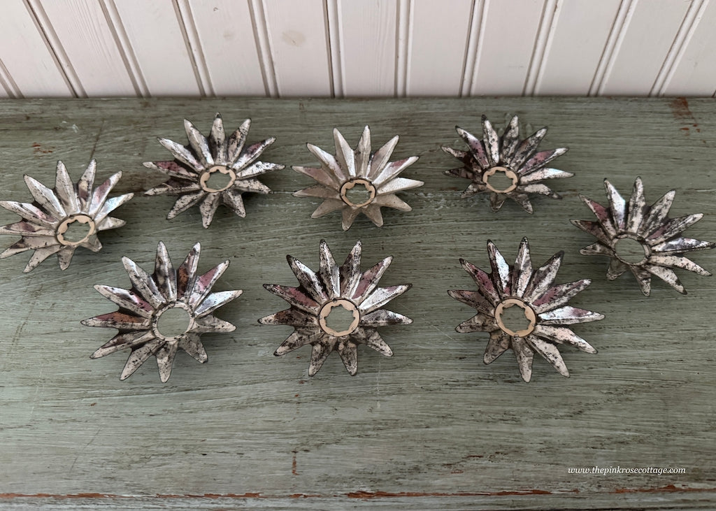 Eight vintage Christmas light reflectors. This sturdy tin is in the shape of a flower or multifaceted star. Measures three inches wide. Some age wear that gives it vintage charm. So lovely on a tree or part of a lit garland or wreath.