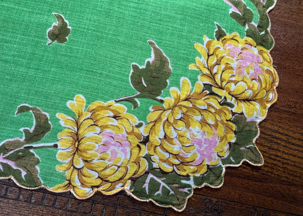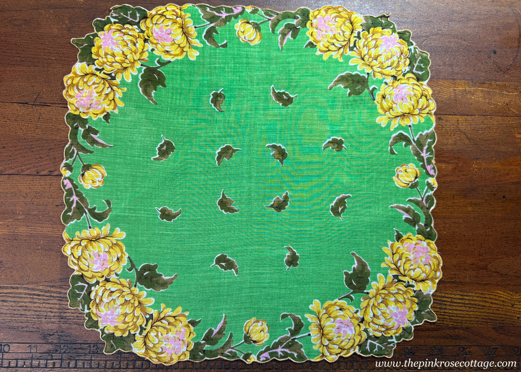 A bright and bold vintage hankie! Features yellow chrysanthemum flowers with pink accents along a scalloped edge. Dark green leaves scattered on a vibrant green cotton background. The photos don't do this hanky justice! The colors are much richer in person.