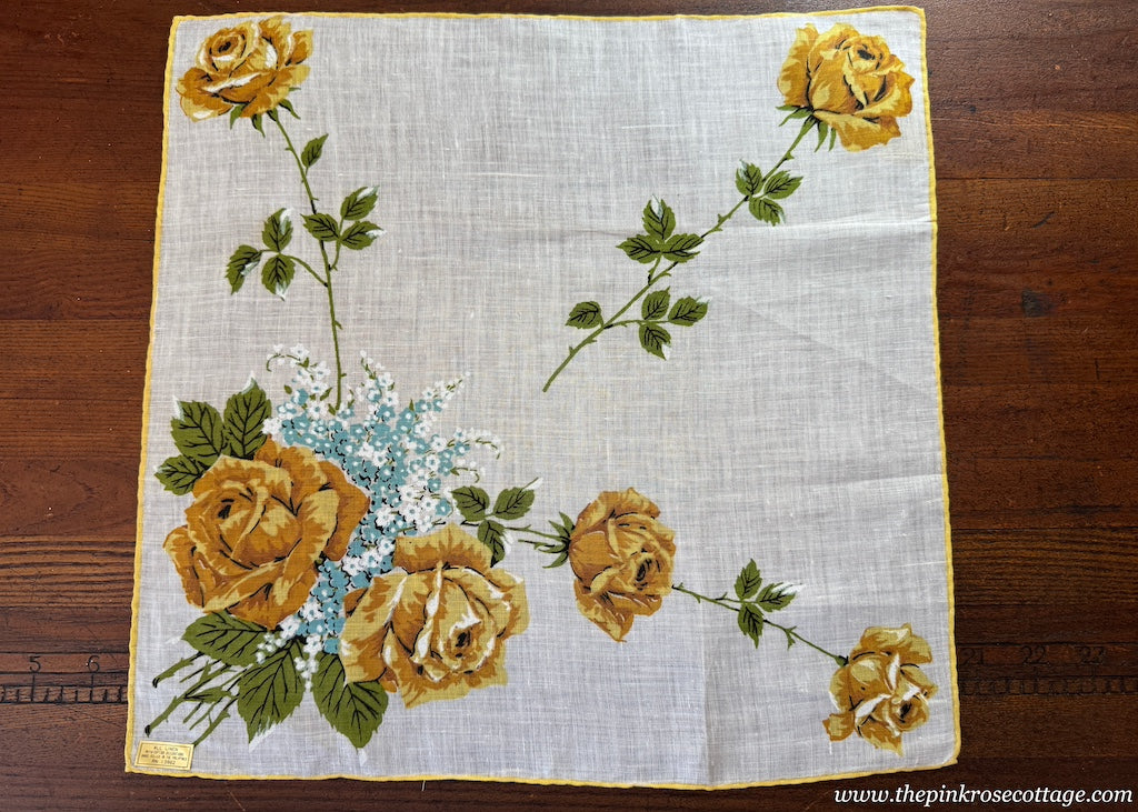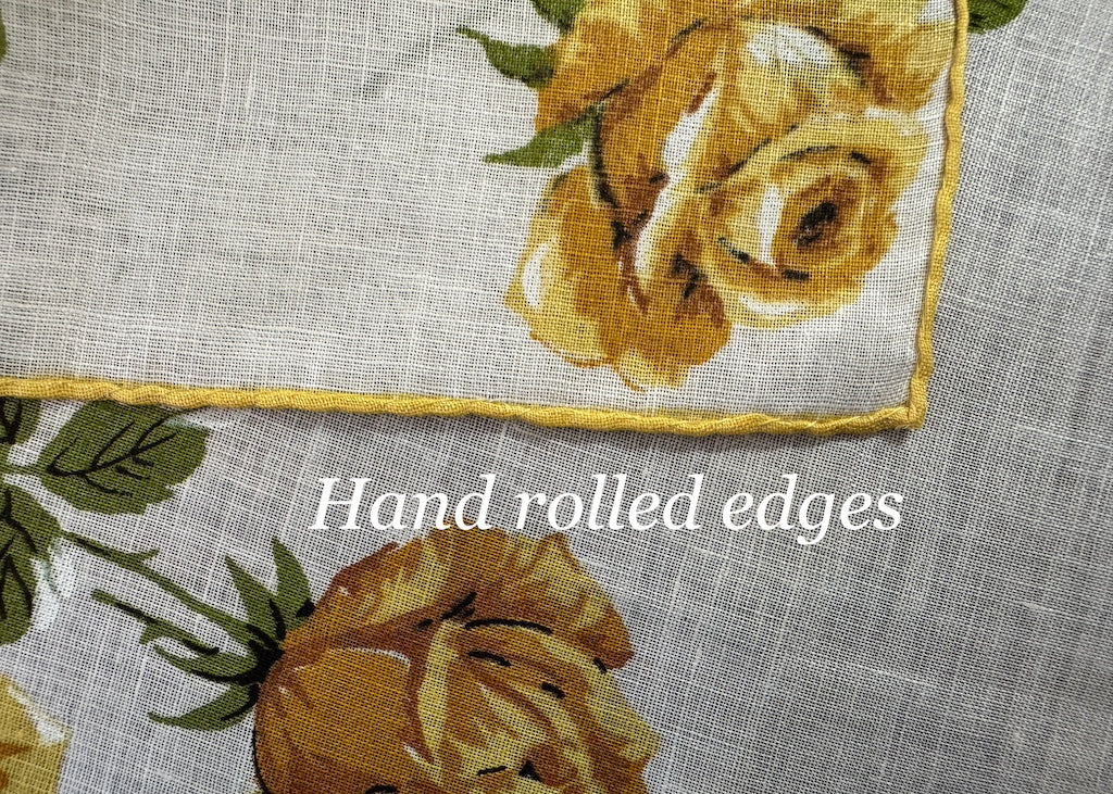 A pretty vintage hanky! Features two large yellow roses and blue and white forget-me-not flowers in one corner with single yellow roses flowing to the other corners. Matching yellow hand rolled edges. A lovely and striking vintage handkerchief!