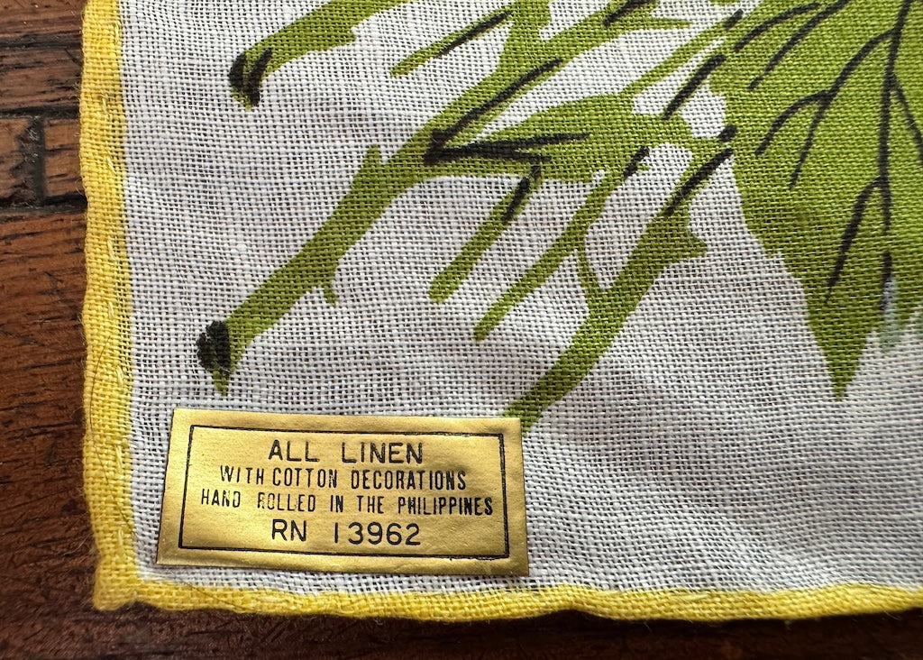 Measures 14 x 14 inches. Retains original tag, "All Linen. " Excellent condition.